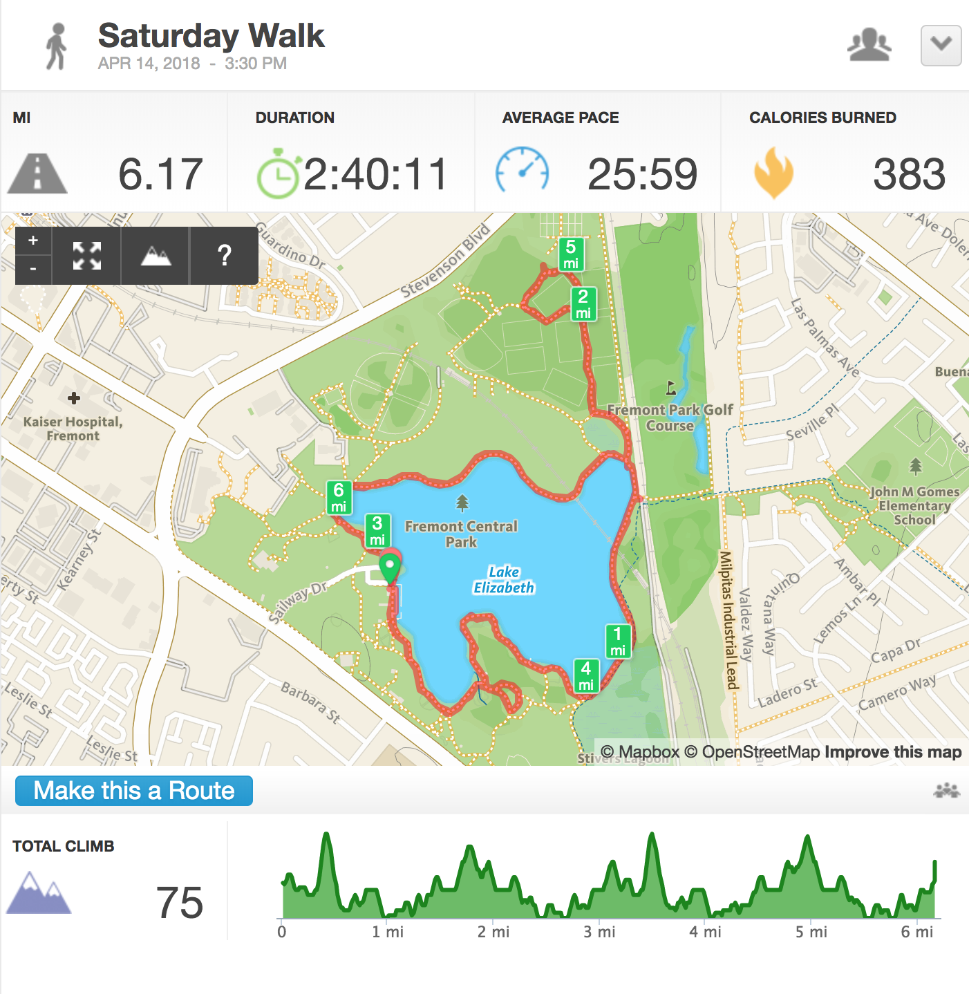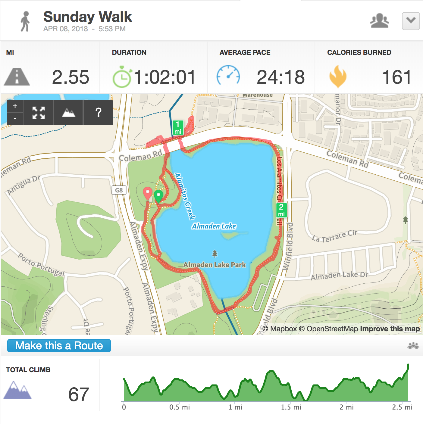 This weekend was not so good . Mrs RF had week long conference last week and was very tired and slept the whole day Saturday. Obviously she could not sleep during night and slept around 5 AM on Sunday and woke up by 10 AM. After having lunch, went to Cataldi Park in San Jose. Food and nice weather made her so sleepy, she had to push herself to walk and walk she did. We walked 6.79 Miles. But Mrs. RF didn’t enjoy her walk, total sleep walking!