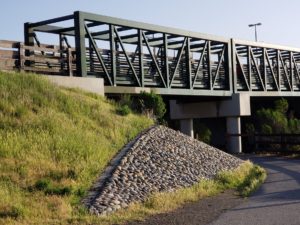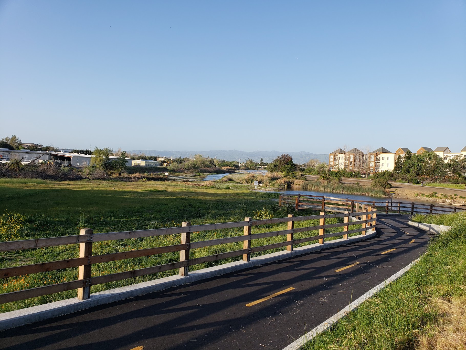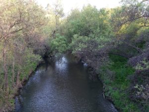 The Los Alamitos Creek full of water with the recent rain, looks like a river.