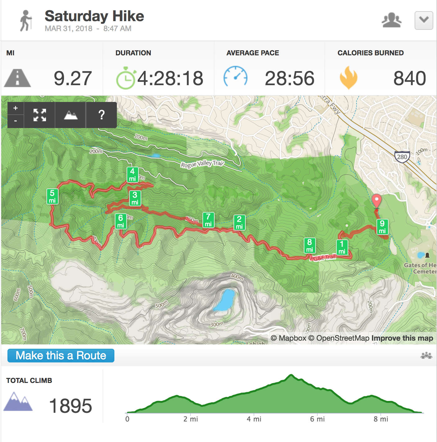 This weekend, we started our hike at 8: 47 AM and went on PG & E Trail. After 2 miles we turned right and went onto Upper Wildcat Canyon Trail. Then we took left onto Upper High Meadow Trail, reached PG & E Vista Point. Took in views and stayed there for few minutes. Along the way, we stopped in many places to take pictures and just enjoy the views, did I say that we love the green mountains here. This will last only for few months, before you know, it will be brown everywhere. So when it is green, we stop often to take in the views.We left PG & E vista point and started coming down by PG & E trail. We are slow hikers, we walk in our own pace and most of the time everyone overtakes us. You can find our pace from the following screenshot.