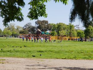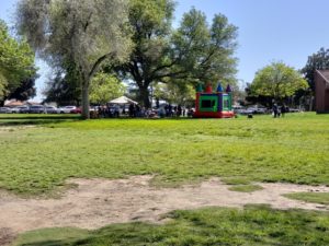 Lot of parties going on in the park with bouncy houses, BBQ, just people hanging out.