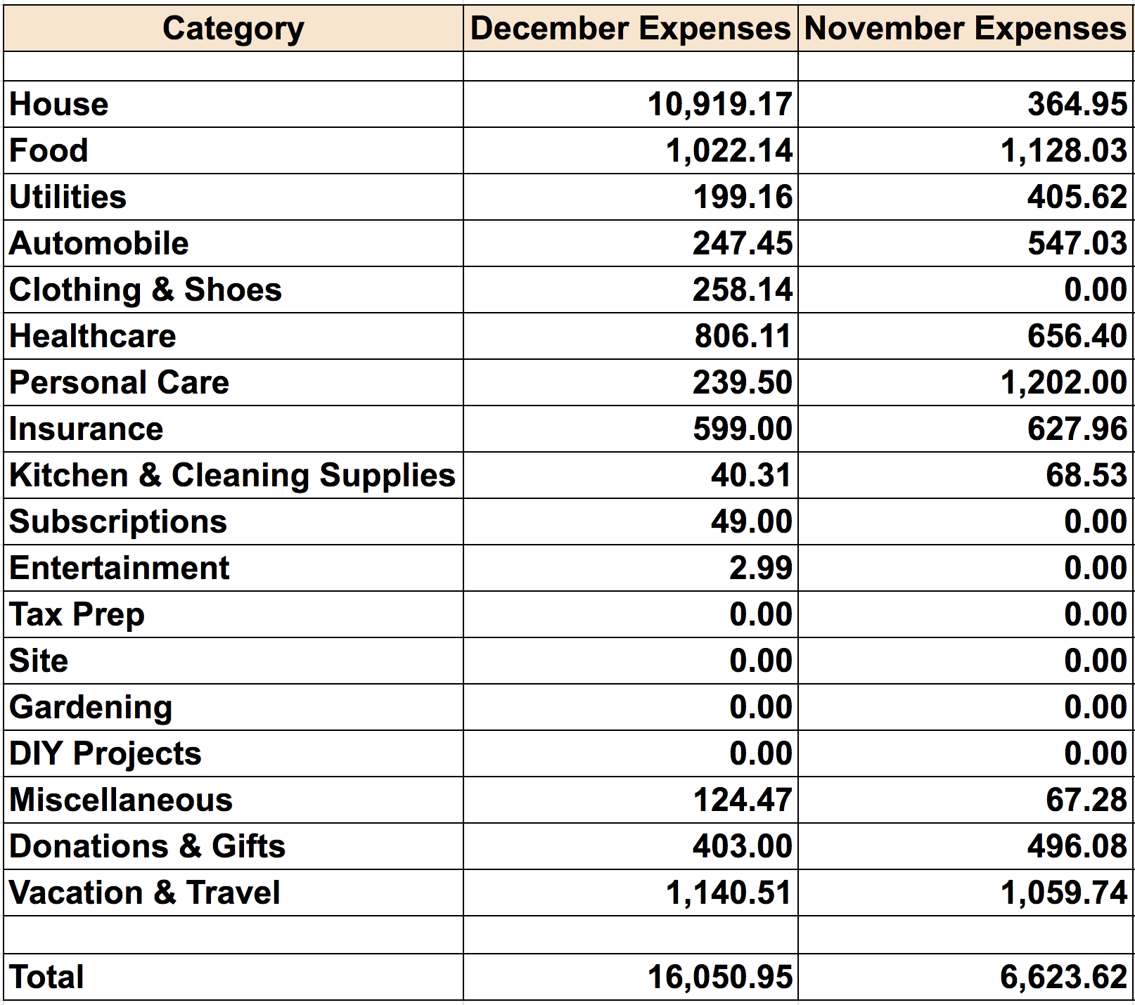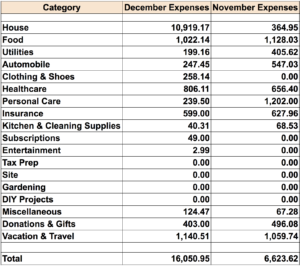 A tumultuous year comes to an end. Lets look at expenses in RF home front. It is the season of giving and the county gets the biggest share via property tax at 10919. Next was Mrs.RF spend on her personal care treatment. She prepaid for those to make case of holiday promotions. Food and groceries were the next big at 1200. This included about 300 expended at Whole Foods. Restaraunt spending was at 190$. The next category was vacation and travel at 1059. Most of it was for future trips. This month also included spending on insurance, an oil change for car and treatment for water softener. Those items brought the grand total to 16050.