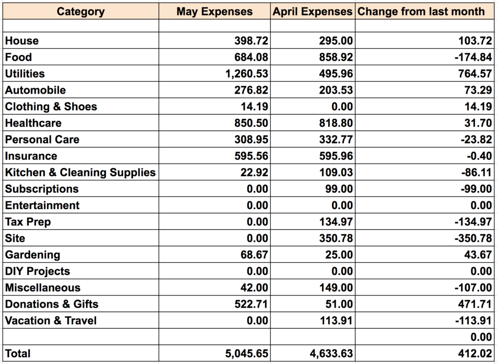 Another month passes by. According to BLS, CPI went up by 0.8% in April . The story at our household is different. It is almost up by 9% from April to May. Now onto the category wise expenses.